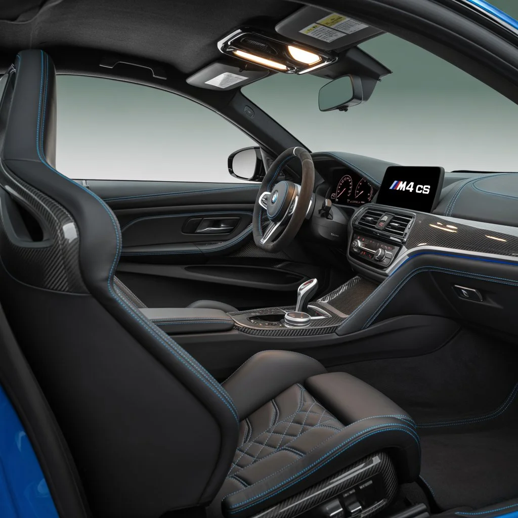 Step inside, and the M4 CS wastes no time reminding you it’s built for drivers who love the craft. Alcantara trim, carbon fiber panels, and minimalist touches define the cabin. BMW even removed the traditional center console cupholders to shave weight, reminding you that this isn’t a car designed around convenience, but performance.